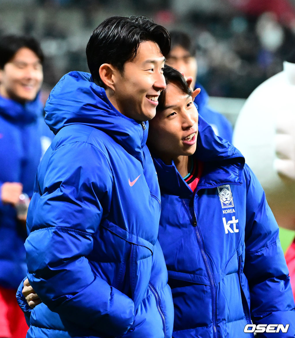 경기를 마치고 대한민국 손흥민, 엄지성이 승리를 기뻐하고 있다. 2025.11.18 /jpnews@osen.co.kr