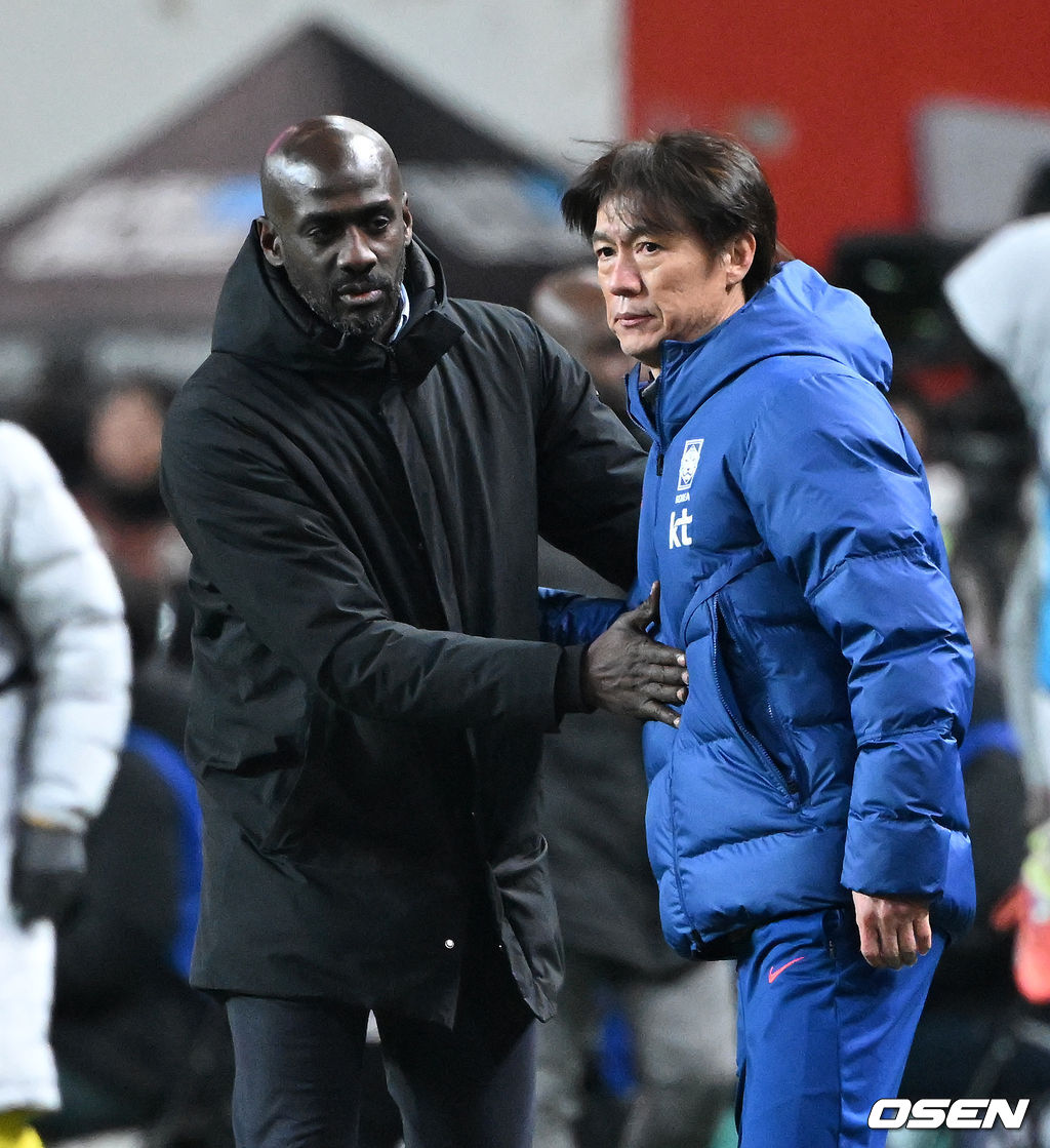 경기 종료 후 대한민국 홍명보 감독이 가나 오토 아도 감독과 인사를 나누고 있다. 2025.11.18 /sunday@osen.co.kr
