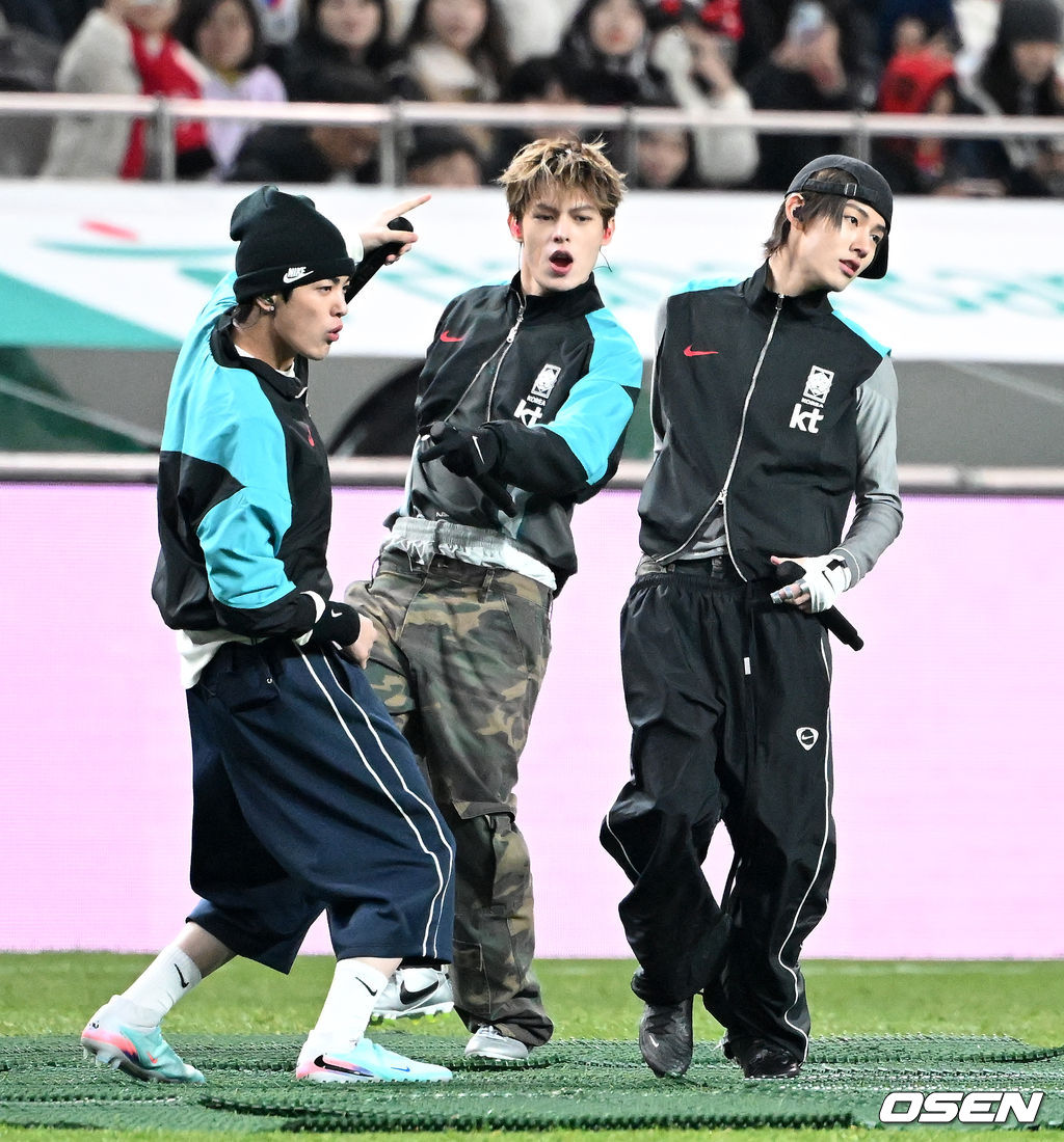 하프타임 때 그룹 코르티스 건호, 제임스, 성현이 공연을 하고 있다. 2025.11.18 /sunday@osen.co.kr