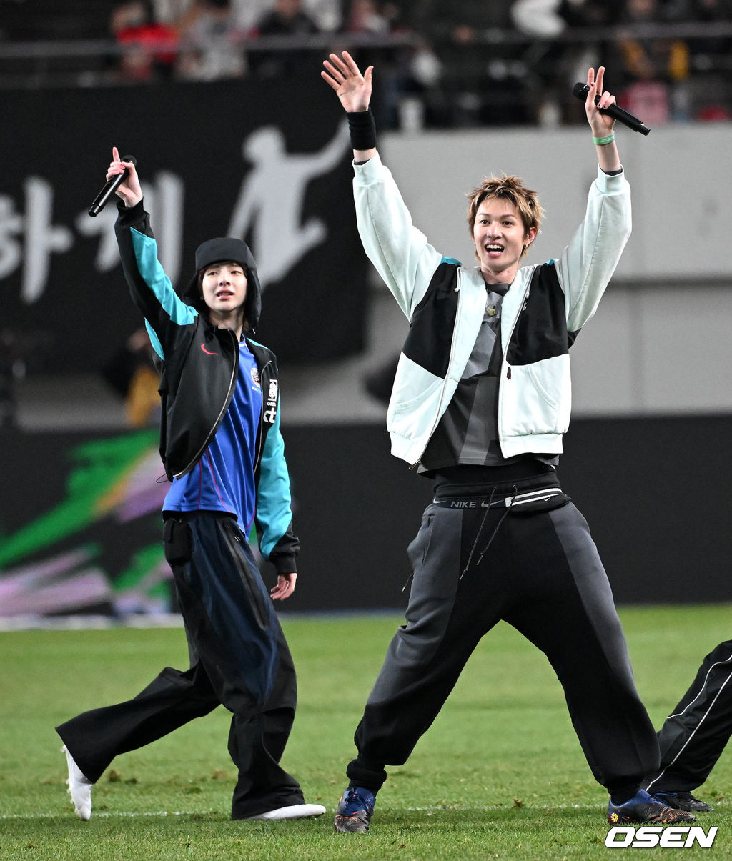 하프타임 때 그룹 코르티스 주훈, 마틴이 공연을 마치고 인사하고 있다. 2025.11.18 /sunday@osen.co.kr
