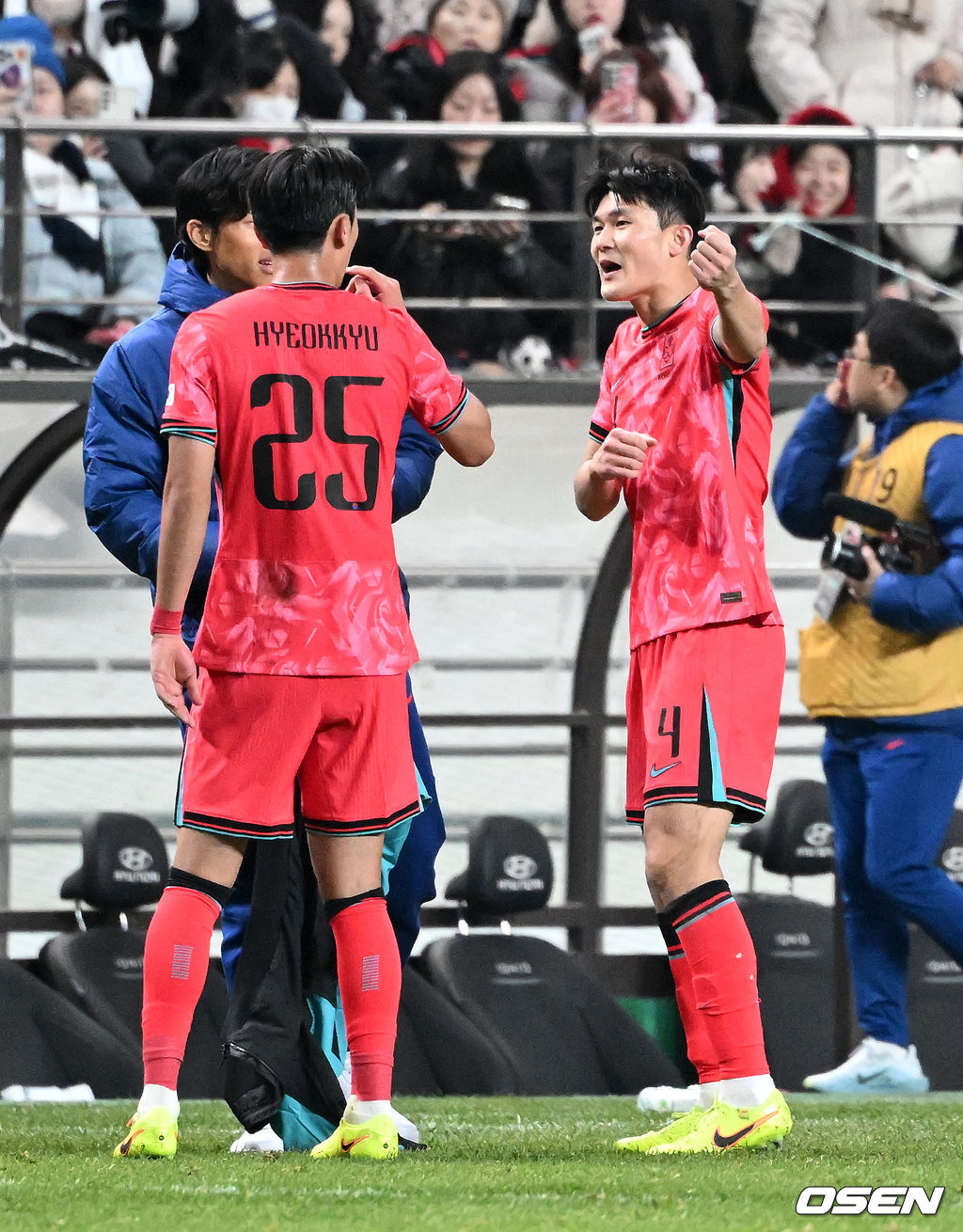 하프타임 때 대한민국 김민재가 권혁규와 이야기를 나누며 그라운드를 나가고 있다. 2025.11.18 /sunday@osen.co.kr
