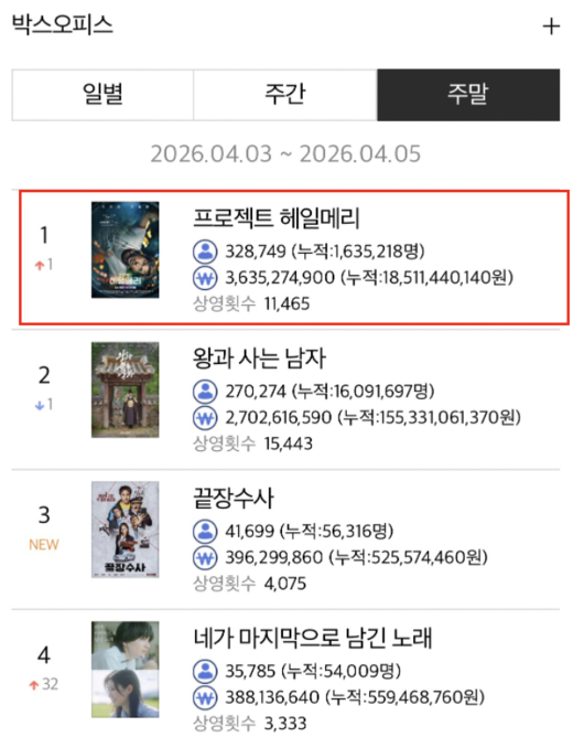 특히 지난 4월 3일(금) '왕과 사는 남자'를 넘고 일별 박스오피스 1위에 등극하며, 마침내 전체 박스오피스 1위를 기록했고 이후 연일 전체 1위에 오르며 흥행 대세작다운 존재감을 제대로 드러냈다. 뿐만 아니라 월드와이드 수익 4억 달러(한화 약 6,353억)를 돌파하며 전 세계적인 인기를 실감케 하고 있다.