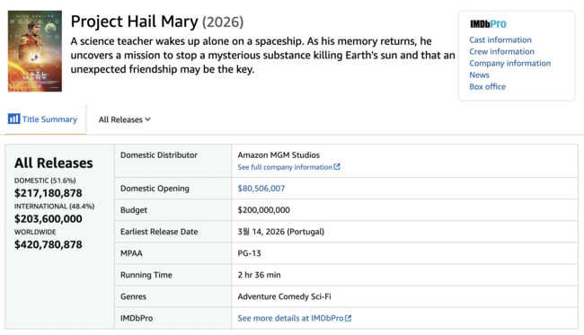 영화관입장관 통합전산망에 따르면 '프로젝트 헤일메리'는 개봉 3주차 주말인 4월 3일(금)부터 4월 5일(일)까지 32만 8,749명의 관객을 동원, 누적 관객수 1,63만 5,218명을 기록했다.