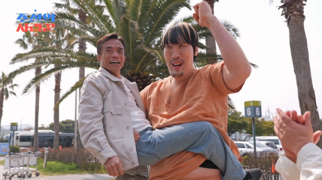 '조선의 사랑꾼' 제작진이 공개한 사진 속 심권호에게서 투병 당시의 어두운 낯빛은 온데간데없이 사라졌다. 그는 의외의 인물인 제주도민 최홍만과 유쾌한 투 샷으로 건재함을 알렸다. '체육계 최단신 거인'으로 꼽히는 158cm의 심권호가 '체육계 최장신 거인' 217cm 최홍만과 나란히 포착된 모습은 시선을 강탈한다. 사진 속의 심권호는 거구의 최홍만을 다리로 꽉 붙잡고 매달려, 고목나무에 달린 매미처럼 익살스러운 포즈로 웃음을 유발했다.