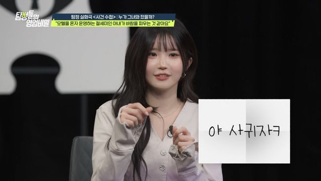 이어진 '사건 수첩'에서는 "모텔을 혼자 운영하는 아내가 바람을 피우는 것 같다"는 남편의 사연이 공개됐다. 의뢰인은 첫사랑이었던 절세미인 아내와 결혼한 뒤 노후를 위해 지방의 작은 모텔을 인수했다. 하지만 고등학교 교사라는 직업 특성상 겸직이 어려워 운영을 아내에게 맡긴 상황이었다. 그러던 중 "남자 혼자 오는 손님이 유독 많다"는 친구의 제보와 함께, "모텔 여사장과 잤다"는 후기까지 등장하며 아내의 외도를 의심하게 됐다. 조사에 착수한 탐정단은 의뢰인의 아내와 단순한 관계로만 보기 어려운 남성 5명을 추려냈다. 이 가운데 돈을 내지 않고도 최고급 객실을 이용하며, 의뢰인 아내에게 돈까지 받는 '연하남'이 유력한 불륜남으로 떠올랐다. 그러나 그는 의뢰인의 아내가 고등학생 때 낳은 아들로 밝혀졌다. 이를 지켜보던 데프콘은 "이 세상에는 생각보다 상식적이지 않은 일이 너무 많다"며 말을 잇지 못했다.