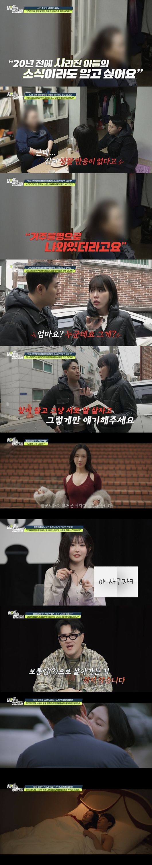 6일 방송된 채널A '탐정들의 영업비밀' 속 '탐정 24시'에서는 "20년 전 행방불명된 아들의 생사라도 알고 싶다"는 어머니의 간절한 사연이 공개됐다. 과거 의뢰인은 남편이 거액의 도박 빚을 지고 잠적한 뒤, 빚쟁이들의 위협 속에 아들을 지키기 위해 모든 빚을 대신 떠안았다. 365일 쉬지 않고 일하던 어머니의 희생을 아는 듯 아들은 성실하고 반듯하게 성장했다. 그러나 스무 살이 되던 해, 아들은 쪽지 한 장 남기지 않고 짐을 챙겨 집을 나갔다. 이후 의뢰인은 온갖 방법을 동원해 수소문했지만 아들의 행방을 알 수는 없었다. 그리고 실종 1년 뒤, 아들은 "집에 안 들어갈 거니까 찾지 말라"는 문자 한 통을 보내왔다. 답답한 마음에 찾아간 심부름센터에서는 "생활 반응이 전혀 없다"는 대답만 돌아왔다. 마지막으로 확인된 주소지는 한 고시원이었지만, 이미 '거주불명' 상태였다.