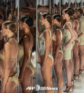 리우 패션위크,'거울 앞에 길게 늘어선 수영복 모델'