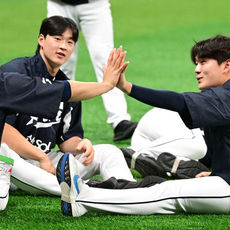 2025.11.07 16: 01문동주, '오늘은 곽빈 형 손 잡고'
