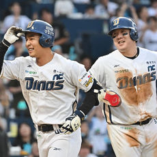 3점홈런 치고 사진 찍는 김휘집과 라일리