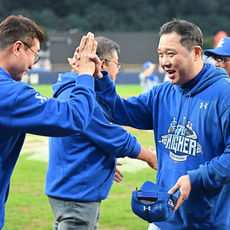 2025.10.07 18: 04준플레이오프 진출 기쁨 나누는 박진만 감독과 이종열 단장