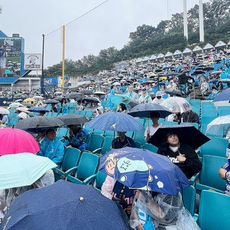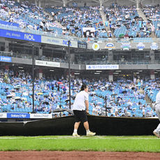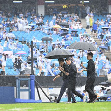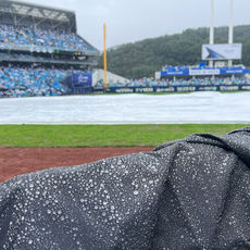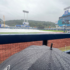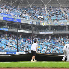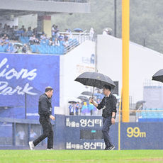 갑자기 내리는 비에 그라운드 체크하는 경기감독관들
