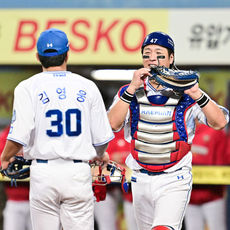 2025.10.13 20: 25안상현 기습번트 막아낸 강민호의 미소