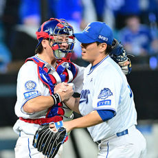 2025.10.14 22: 06준PO 4차전 지켜낸 삼성 김재윤-강민호 배터리, '싱글벙글'