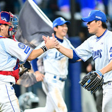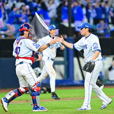 2025.10.14 21: 46승리 지켜낸 삼성 김재윤-강민호 배터리, '대전으로 가자'