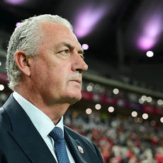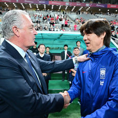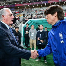 인사 나누는 파라과이 구스타보 알파로 감독과 홍명보 감독