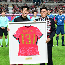 차범근에게 유니폼 전달 받는 손흥민 '전설은 계속된다'