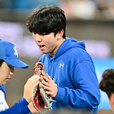 2025.10.14 19: 13얼굴 찡그리는 김영웅,'아직 허리 통증 있어요'