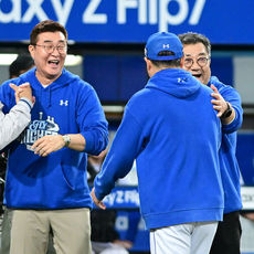2025.10.14 22: 15박진만 감독과 플레이오프 진출 기뻐하는 삼성 유정근 사장-이종열 단장