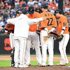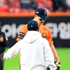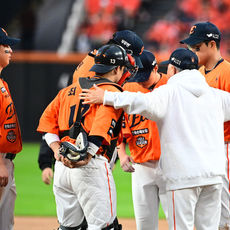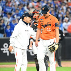 2025.10.18 17: 28마운드 방문한 김경문 감독,'홈런은 잊자'