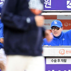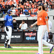 2025.10.18 15: 22구자욱, 한화 더그아웃 바라보며 하소연