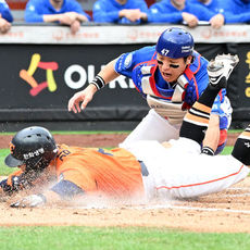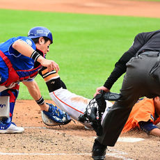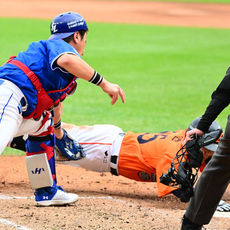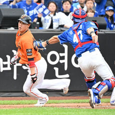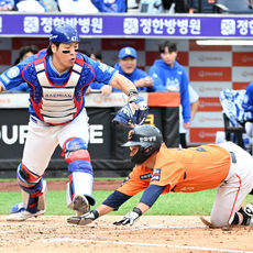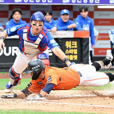 2025.10.18 14: 49김태연, 강민호에 앞서 홈 세이프