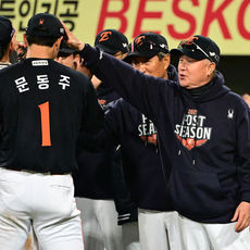 문동주와 승리 하이파이브하는 김경문 감독