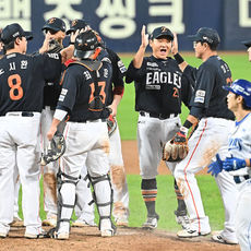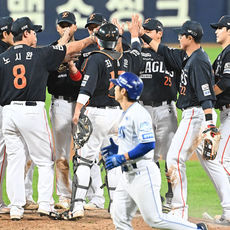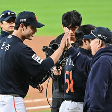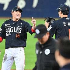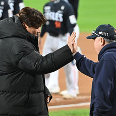2025.10.21 21: 51류현진과 승리 하이파이브하는 김경문 감독