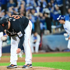 2025.10.21 20: 03입술 꽉 깨문 류현진, 김영웅에 역전 3점 홈런 허용