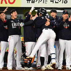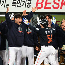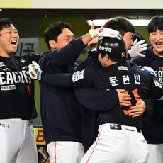 2025.10.22 20: 35문현빈 3점포에 기뻐하는 한화 더그아웃