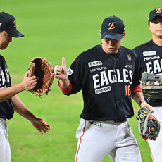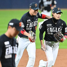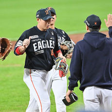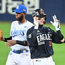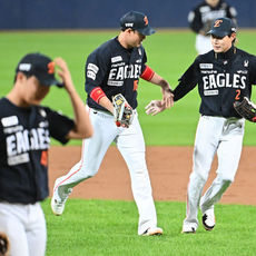 2025.10.22 19: 40병살 잡은 정우주에게 엄지척 하는 하주석