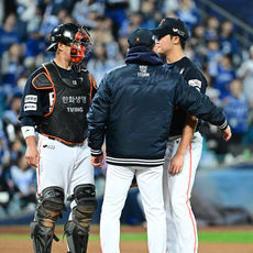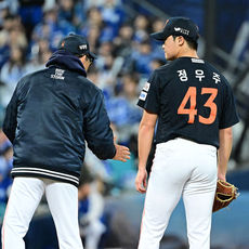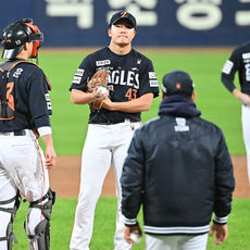 2025.10.22 19: 40선발 정우주 다독이는 한화 양상문 투수코치