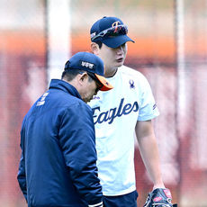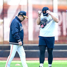 2025.10.24 15: 15김서현-양상문 투수코치, '플레이오프 5차전 앞두고 훈련'