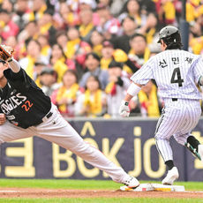 2025.10.26 14: 19신민재,'빠른 발로 출루 성공'