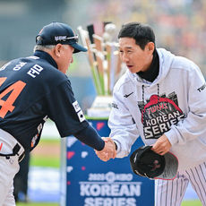 2025.10.26 14: 081차전 앞두고 악수 나누는 김경문-염경엽 두 감독