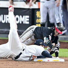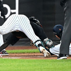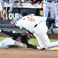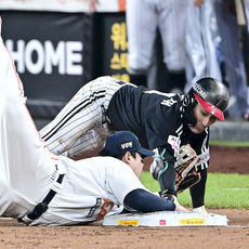 2025.10.29 19: 29적시타 치고 오버런으로 아웃되는 신민재