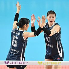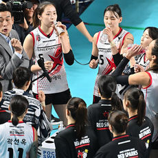 1세트 극적인 동점 만들고 기쁨 나누는 정관장 선수들