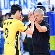 2025.11.15 16: 15임성진과 승리 하이파이브 나누는 KB손해보험 레오나르도 카르발류 감독
