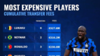 [OSEN=이균재 기자] 로멜루 루카쿠(첼시)가 누적 이적료 1위에 올랐다.독일축구 이적 전문사이트인트랜스퍼마르크트는 14일 공식 SNS에 누적 이적료 가장 비싼 선수 톱10을 공개했다.올여름 인터 밀란서 첼시로 이적한 루카쿠가 1...