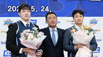 [OSEN=지형준 기자] 24일 오후 서울 서초동 KCC 본사에서 이승현, 허웅의 KCC 입단식이 열렸다.지난 시즌 9위에 머물렀던 전주 KCC는 자유계약선수(FA) 최대어로 꼽히는 이승현과 허웅을 동시에 영입, 즉각적인 전력 보강을 통해 다음 ...